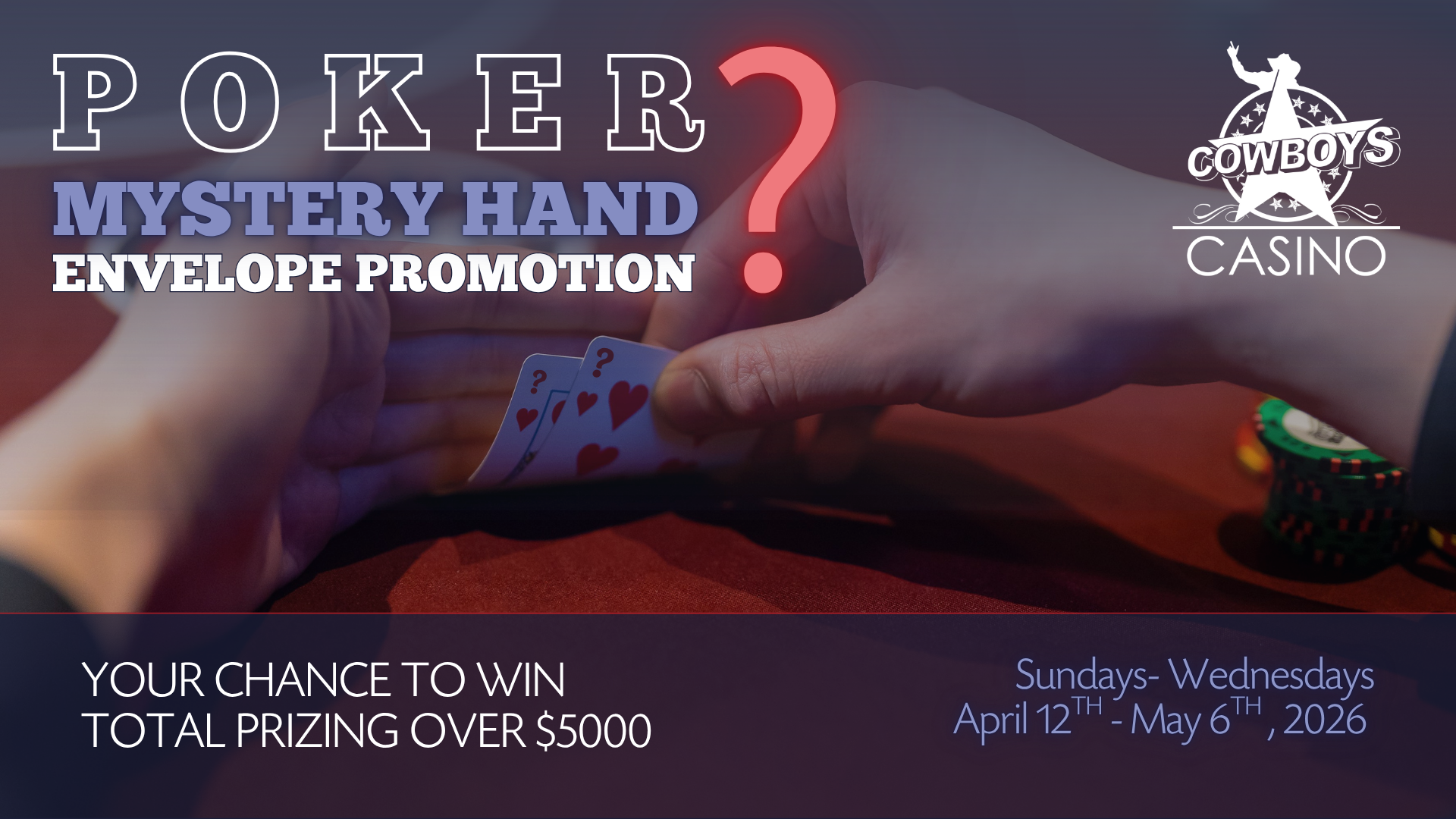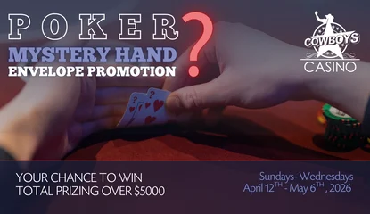 Cowboys Casino features an uncapped Bad Beat Jackpot. When qualifying hands are beaten at the table, players can win a share of the jackpot.